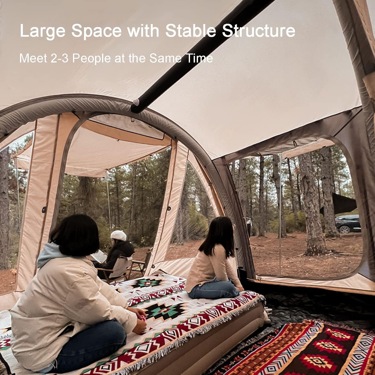 - 【Easy Setup】Car tents are designed with inflatable columns instead of metal poles, making it quick and convenient to set up. The inflatable column design significantly reduces setup time, saving you time and offering added convenience. It also enhances the tent s sturdiness and resistance to wind.